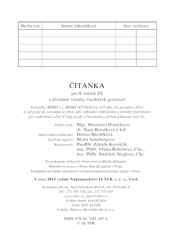 Ukázky ze světové i české literatury od počátků písemnictví do konce 19. stol. jsou řazeny chronologicky. Čítanka postupuje po lekcích, z nichž každá obsahuje prózu, báseň a nejméně jedno výtvarné dílo. Nezbytným doplňkem čítanky je sešit Literární výchova 8.
